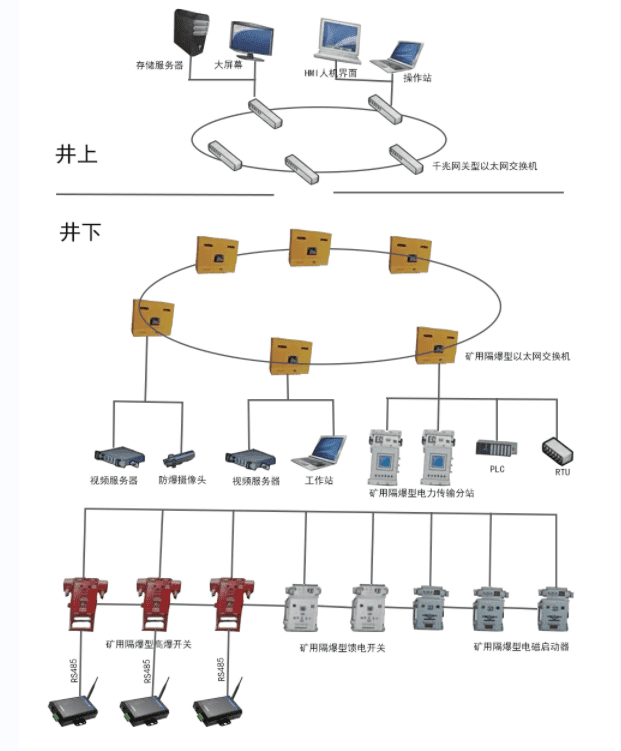 By adding an RS485 Tri-mode Converter WE-KT700 to each mining flameproof/explosion-proof high-voltage switch, the traditional flameproof switch becomes an intelligent high-voltage switch with network communication capability. The two communicate via the RS485 interface. Using any of the WE-KT700's network communication interfaces (Ethernet/Fiber/WiFi), the monitoring parameters of the high-voltage switch can be transmitted to the application server platform software on the surface, enabling timely monitoring of underground power conditions and safety. The application topology diagram of the entire system is as follows: